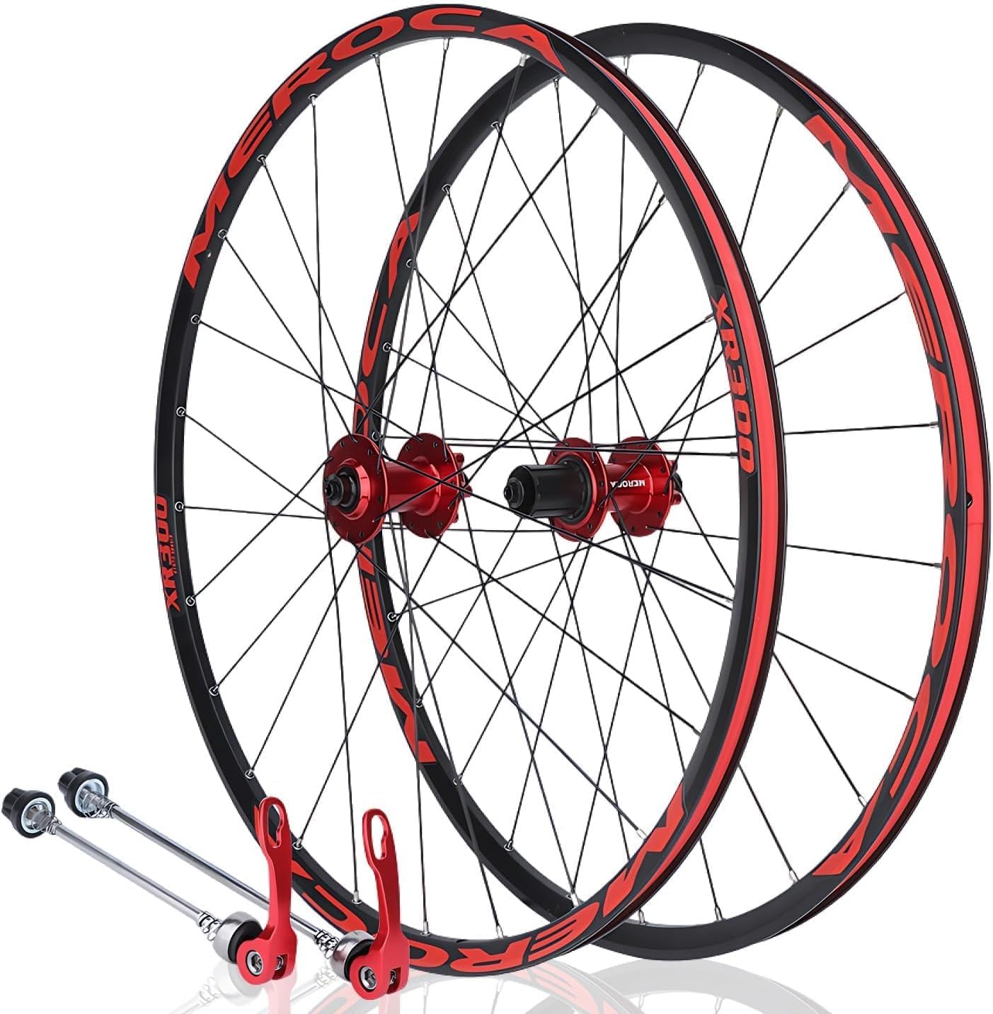 Front Rear Wheel Specifications:Color: Black, RedSize: 26 inch / 27.5 inchRims: Double-layer aluminum alloy rimsRivets: increase the strength of the rim and the spokes are stressed more evenlyNumber of holes: 32 holesQuick release: Front 100 Rear 135 mmHubs: 6 bolt disc brake, 2 front rear hubs, 5 bearingsSpokes: Black round spokesAir nozzle: Schrader valveFreewheel: 8/9/10/11 speed cassette flywheelSuitable for: Mountain bikeWeight:26 inch wheelset weight 1625g27.5 inch wheelset weight 1815gThe package includes:- Wheel set (front-rear)- QR skewers x2- Tire pads x2- Spacer x1