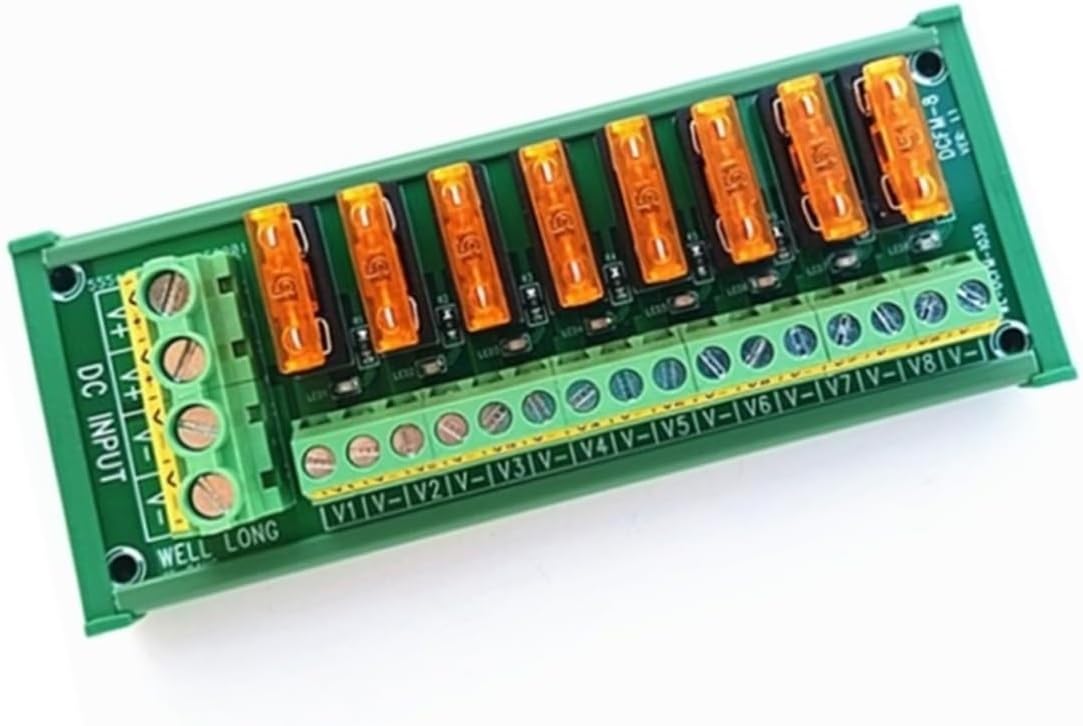 8 Position DIN Rail Mount DC Power Fuse Distribution Strip Module Terminal Block Working Voltage: DC 5 to 32V.Maximum Total Input Current: 30 Amps.8 Channels output, each channel maximum output current 3 Amps (Factory-installed fuse value 5 Amps, you can replace the fuse to support up to 10 Amps.)Fuse holders for Medium Blade ATO/ATC Fuse, the fuse can be removed and replaced very easily. With fuse fail indication function, when you connected and the fuse has blown or has been unplugged, green indication LED will turn on.FR-4 fiberglass dual copper layers PCB.Width42mm High quality fireproof nylon material DIN rail mount for carrier, can support width 35mm rail.Input Terminals: pitch 7.62mm/0.3", maximum current 30 Amps for per position, wire size 26~10 AWG, stripping length 8mm, Metric M3 slotted screw. Support power supply expansion connect to other modules.Output Terminals: pitch 5.08mm/0.2", wire size 26~12 AWG, stripping length 7mm, Metric M2.5 slotted screw.