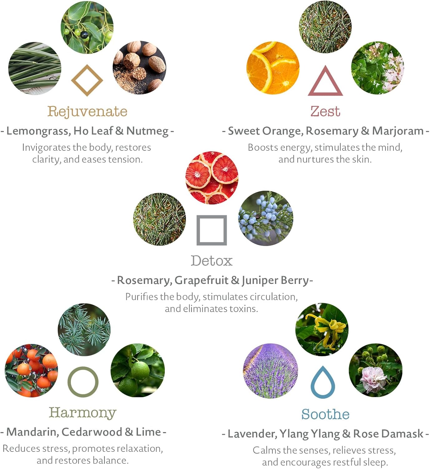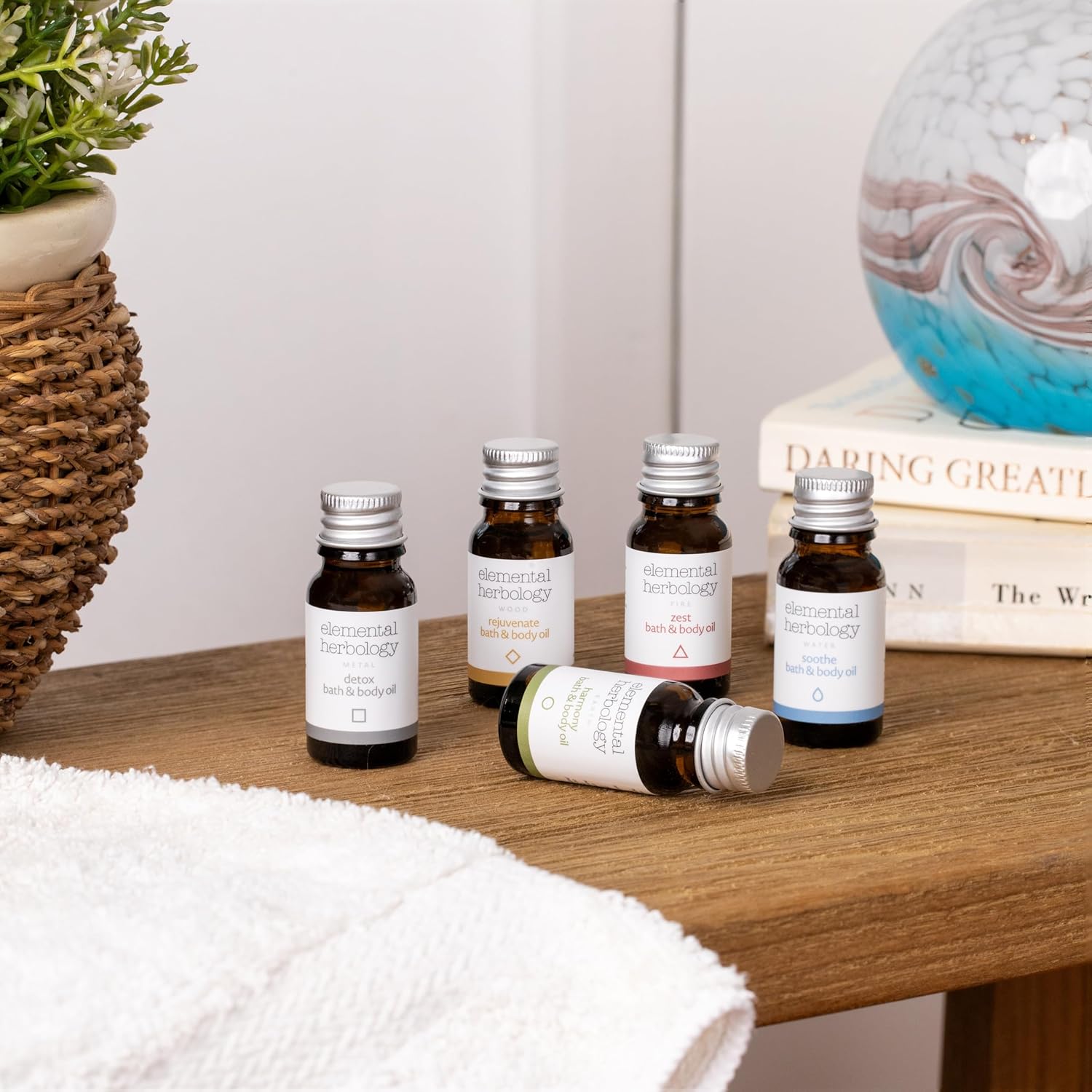 Discover the transformative power of Elemental Herbology's Five Elements Bath & Body Experience. This collection features five distinct 100% natural aromatherapy oils, each expertly blended to balance the elements of Wood, Fire, Earth, Metal, and Water. Choose from Rejuvenate with invigorating lemongrass and nutmeg, Zest featuring uplifting sweet orange and rosemary, Harmony with soothing mandarin and cedarwood, Detox combining clarifying rosemary and grapefruit, or Soothe with calming lavender and rose damask. These versatile oils can be used multiple ways - add to your bath for a luxurious soak, apply before stepping into the shower, or massage directly onto clean, dry skin. Each oil combines nourishing base ingredients like apricot kernel oil, peach kernel oil, and jojoba seed oil to leave your skin feeling soft and hydrated. Create your own personalized self-care ritual by selecting the perfect aromatic blend to match your mood and restore balance to both mind and body.