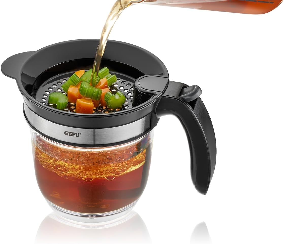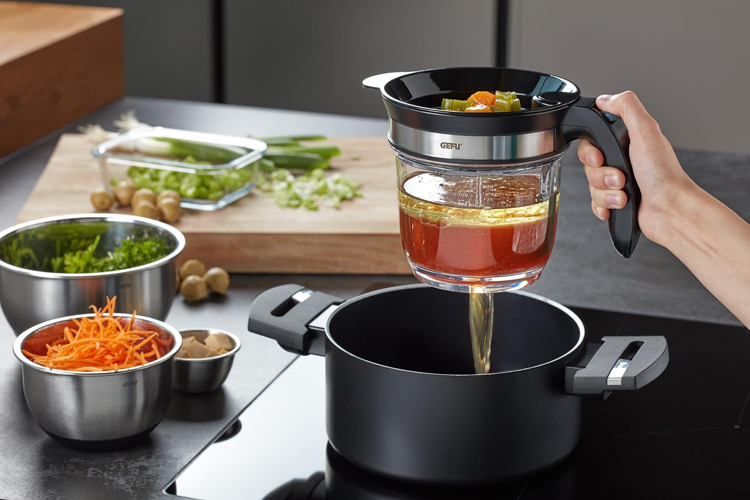 With Fluido, hot soups, sauces or roast funds finally get their fat away. Simply fill into the separating jug: the grease settles at the top and the degreased liquid at the bottom, from where you can easily remove it at the touch of a button through the outlet opening in the bottom of the jug.