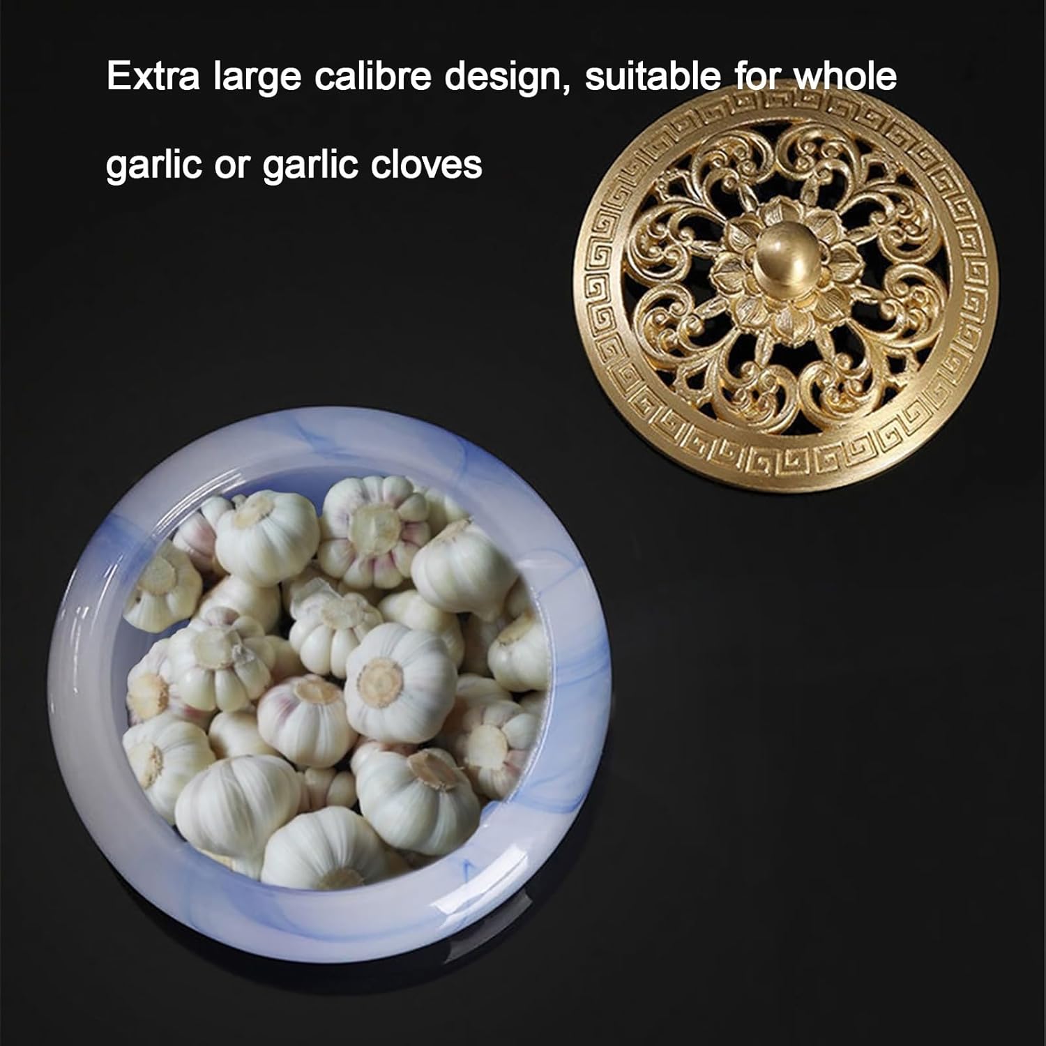 Features:-- garlic holder is a must-have item for kitchen, dining room and food lovers, it can help you to store and decorate your kitchen at the same time.-- garlic keeper is made of natural high territory high temperature firing, the surface is smooth and delicate, the whole body is glazed, thickened and sturdy, and it can be used for a long time.-- garlic container with lid, copper lid, hollow carving pattern, with ventilation holes, ventilation to keep garlic dry and fresh.-- Easy to cleaning, smooth interior, not easy to leave stains, water or foam can be easily cleaned.-- Multi-functional garlic storage, can store garlic, ginger, chilli, onion and other spices, candy, tea and even rings which are not easy to store in life.-- Chinese style garlic jar with top bead on the lid for easy opening and gripping, can be well integrated into your kitchen, dining table, cafe, etc..-- Believe your family, friends, food lovers will love this surprise storage jar.Specification:Size: 9.5*7*5.5*3cm/3.74*2.75*2.16*1.18inPackage include:1*garlic holder