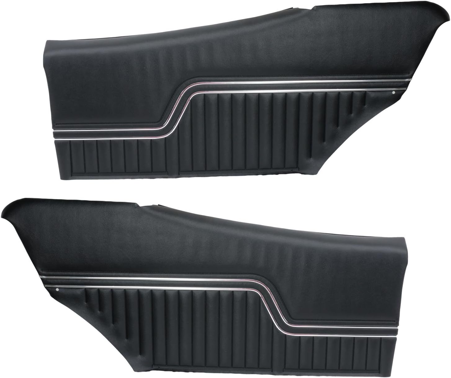Replace the interior rear side panels in your 1970-1972 Chevelle with this new set from Parts Unlimited. These rear side panels feature a metal top rail, windowfelt brand weatherstripping, door lock ferrule, and madrid grain vinyl. These side panels also have parallel chrome mylar strips across the top of vertical dielectric pleats and wide chrome mylar strip at the bottom of the panel. These rear side panels are pre-assembled and ready to install. 1970-1972 Chevelle. Ready to install. Black. Camaros & Classics part # PD240C.