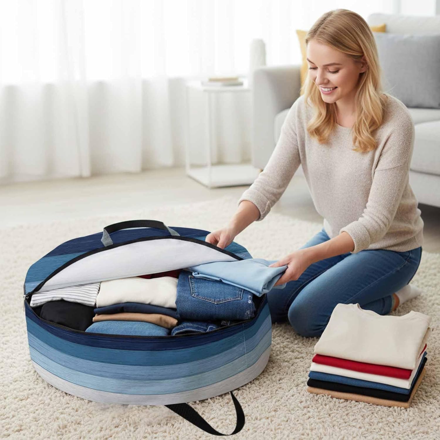 Reclaim Your Closet Space with the Round Storage Solution! Material: polyester Diameters: 24 inch, 30 inch, 36 inch Depth: 7 inches Package Includes: Round Storage Bag One Bag, Endless Possibilities: Whether you are swapping out your summer wardrobe, moving into a new dorm, or packing away holiday decorations, this bag has you covered. The circular design is uniquely suited for: Bedding: Comforters, quilts, sheet sets, and oversized pillows. Clothing: Winter coats, sweaters, and bulky ski gear. Home Decor: Holiday wreaths, garlands, and floral arrangements. Outdoor Gear: Camping blankets, sleeping bags, and beach towels. Dual Zippers: The high quality double zipper design allows the closet organizer to open wide from both sides, making it effortless to load and unload even the bulkiest comforters or wreaths. Reinforced Handles: Sturdy, reinforced handles are securely stitched to provide extra strength and a comfortable grip when carrying heavy loads or pulling the bag from under a bed. Clear Label Pocket: A transparent built-in label holder allows you to quickly identify the contents of each bag without ever having to unzip it, keeping your storage perfectly organized.