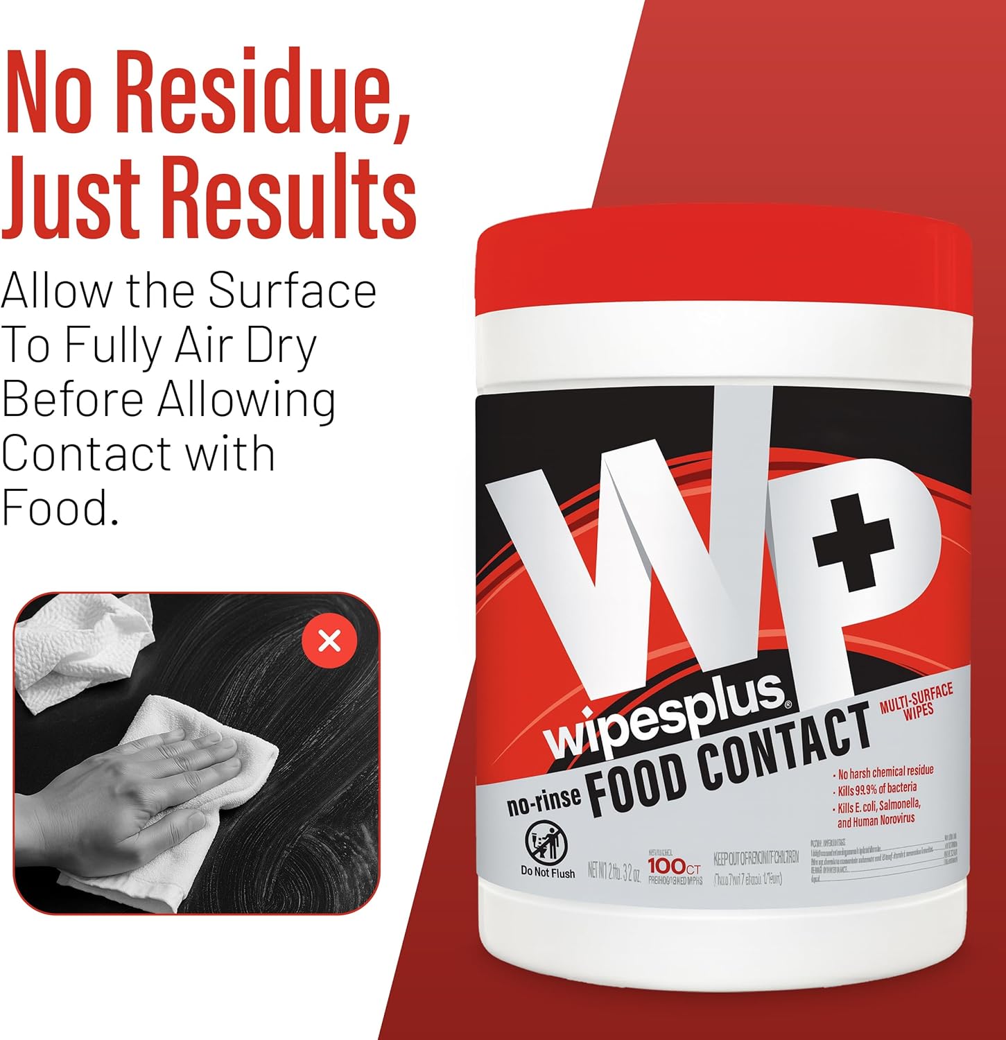 WIPESPLUS No-Rinse Food Contact Multi-Surface Wipes are designed to simplify cleaning while delivering powerful results in both professional and home environments. These convenient wipes combine three functions in one, working to clean, disinfect, and deodorize with a quick dry formula that leaves no streaks or sticky residue behind. Ready to use straight from the canister, they reduce the need for paper towels and spray bottles, making them a smart choice for efficiency and convenience. The formulation sets these wipes apart for use in kitchens, dining areas, and food service environments. Each canister includes 100 wipes, making them practical for cafeterias, restaurants, hotels, and institutional facilities, while also being a reliable option for households looking for an easy cleaning solution. These wipes can be used on a wide variety of washable, hard, non-porous surfaces including tables, stoves, cooktop grills, refrigerators, microwave ovens, food trays, thermometer probes, dining booths, condiment areas, host or hostess stations, laminated menus, beverage dispensers, sinks, cabinets, doorknobs, and chair handles. They are also suitable for materials such as acrylic, finished wood, glass, glazed ceramic, glazed porcelain, metal, sealed granite, sealed marble, stainless steel, synthetic leather, vinyl, and plastic. Even delicate environments like highchairs, booster seats, strollers, cribs, and countertops can be cleaned without scratching. Whether used in restaurants, schools, offices, or homes, WIPESPLUS No-Rinse Food Contact Multi-Surface Wipes provide a practical and effective cleaning solution. With 3-in-1 action, a quick-drying, no-residue formula, and food-contact safety, these wipes deliver both versatility and reliability for everyday cleaning (Model Number: 33818)
