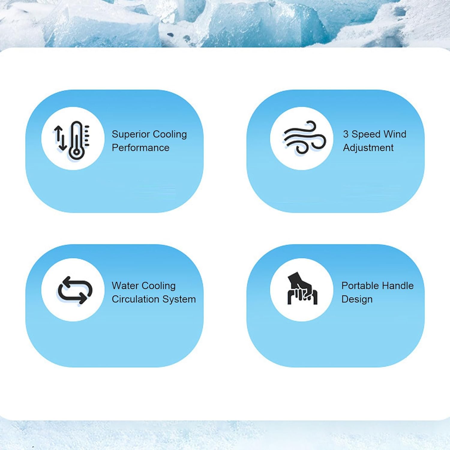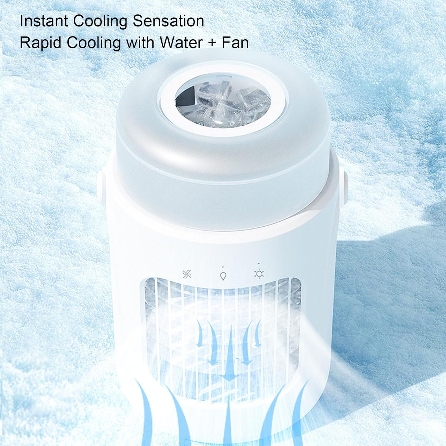 Spec: Item Type: Desktop Air CoolerMaterial: ABS Battery Type: Lithium ion Battery Battery Capacity: 10000mAh (Shipped with Built in Battery) Wind Speed: 3 Levels Water Tank Capacity: 600ml Package List: 1 x Desktop Air Cooler 1 x USB Cable 1 x User Manual How To Use: Fan Function: Short press the fan button to start the fan. Short press again to adjust the fan speed. Press once to increase the speed, and press the fan button again when it reaches the third speed setting to turn off the fan. Mist Function: While the fan is running, short press the mist button to control the mist function. The mist indicator light will turn on and off accordingly. Light Function: 1. Short press the light button to turn on the color changing lights. 2. Press the light button again to freeze the light at a specific color. 3. Press the light button a third time to turn off the light panel. Mist Timer: After activating the mist function, it will run for 6 hours on a timer. The mist will stop when the timer is up, and the mist indicator light will turn off. Indicator Lights Status: Fan Indicator Light: White light indicates the fan function is on. One light for low speed, two lights for medium speed, and three lights for high speed. The light will blink when the battery is low. Mist Indicator Light: White light indicates the mist function is on. Light Indicator Light: White light indicates the light function is on.